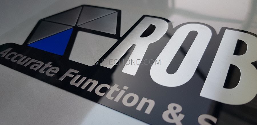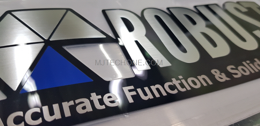 헬스기기 메인 브랜드 네임플레이트(500 X 70 X 1T) 베이스 블랙사출 표면 PET 후면 인쇄 강화 코팅 면에 2D 헤…